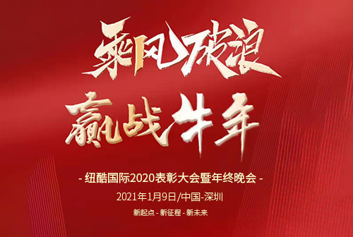 紐酷國(guó)際2020年表彰大會(huì)暨年終晚會(huì)在2021年1月9日在中國(guó)深圳(也就是深圳總公司)深圳坂田神州電腦大廈百瑞達(dá)宴會(huì)廳舉辦年終晚會(huì)?!盎仡?020年我們經(jīng)歷了太多的艱辛與感動(dòng),一路上我們不忘初心,砥礪前行,攜手克服了一個(gè)又一個(gè)困難,完成了一個(gè)又一個(gè)看似不可能完成的目標(biāo),感恩有您,一路同行?!痹谕頃?huì)中表彰了一年來辛勤付出的同事們,還有公司對(duì)未來的展望,新的一年的發(fā)展計(jì)劃?!白屛覀冃碌囊荒晷顒?shì)待發(fā),凝心聚力,重新?lián)P帆起航,供應(yīng)牛年!”