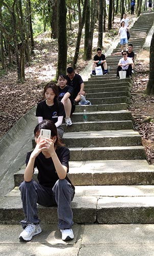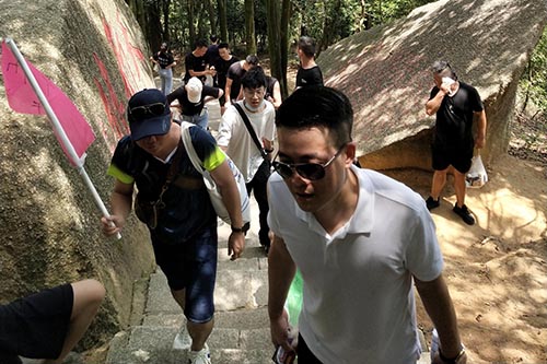 翻過無數(shù)的曲折小徑,越往上,山澗的階梯也逐漸變得陡峭,山路險峻開始顯現(xiàn)。而風(fēng)景常在險峰,唯有克服了它的險,才能領(lǐng)略到它的美。經(jīng)過了將近兩小時的攀登,各分隊陸續(xù)登頂。