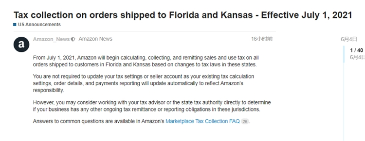 近日亞馬遜美國站發(fā)布一則公告稱,將對運往佛羅里達州和堪薩斯州的訂單征稅。亞馬遜公告如下: