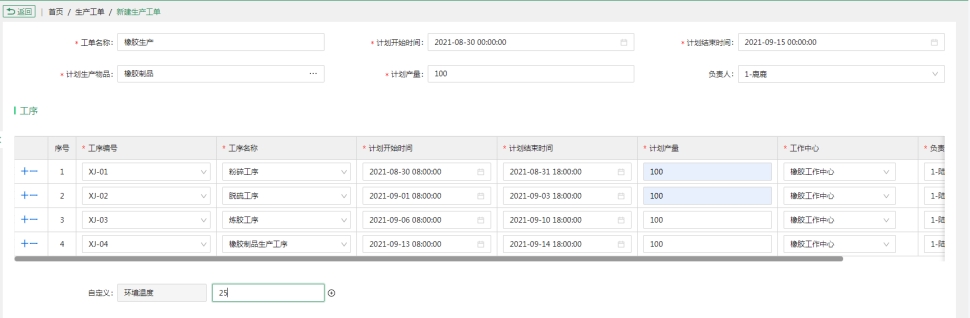 2.需要生產(chǎn)時(shí),新建生產(chǎn)工單,單據(jù)內(nèi)會(huì)記錄工單的計(jì)劃生產(chǎn)物品及計(jì)劃開始與結(jié)束時(shí)間,所需工序以及工序計(jì)劃時(shí)間。
