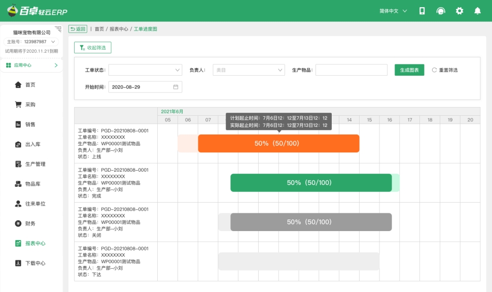 4.報(bào)表中心支持查看工單進(jìn)度圖及工作中心進(jìn)度圖。