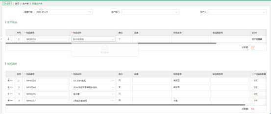 在新建生產(chǎn)單時(shí),選擇成品與原料可通過選擇生產(chǎn)BOM來快捷選擇。