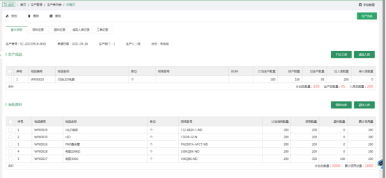 在生產(chǎn)單列表,會(huì)顯示全部生產(chǎn)單。在生產(chǎn)單詳情界面,可實(shí)現(xiàn)領(lǐng)料、退料、產(chǎn)成品入庫并可快速流轉(zhuǎn)生成派工單。