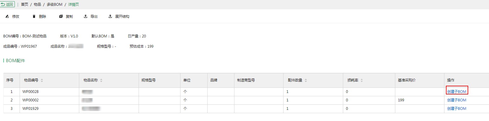 在多級BOM詳情頁,支持為BOM中的配件創(chuàng)建子BOM