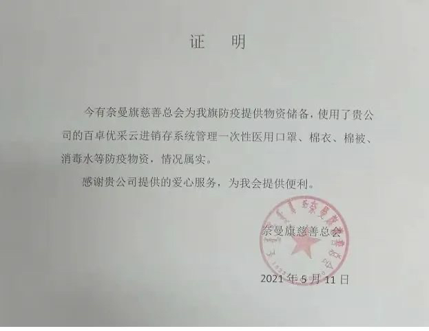 5月11日,百卓網(wǎng)絡(luò)科技有限公司收到來自奈曼旗慈善總會(huì)的一封感謝信。該會(huì)使用百卓?jī)?yōu)采云進(jìn)銷存系統(tǒng)管理一次性醫(yī)用口罩、棉衣、棉被、消毒水等防疫物資,經(jīng)過工作人員溝通了解,百卓網(wǎng)絡(luò)科技有限公司決定免費(fèi)贈(zèng)送奈曼旗慈善總會(huì)一年的進(jìn)銷存系統(tǒng)的使用權(quán)!